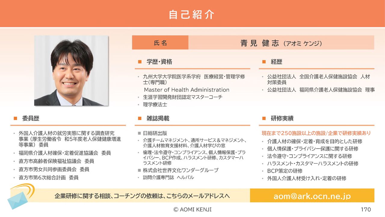 10年近く、様々な介護施設で倫理・法令遵守(コンプライアンス)の研修をしてきました。